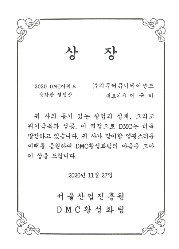 2020 서울산업진흥원 2020 DMC어워드 페이지 정보 작성자 WeDu 댓글 0건 조회 5,156회 작성일 21-12-31 12:57 본문 2020-11-27 2020 DMC어워드 용감한 열정상 서울산업진흥원 DMC활성화팀 List Previous2020 기술혁신 우수기업 21.12.31 Next2018 소년한국 우수 어린이 도서 19.05.30