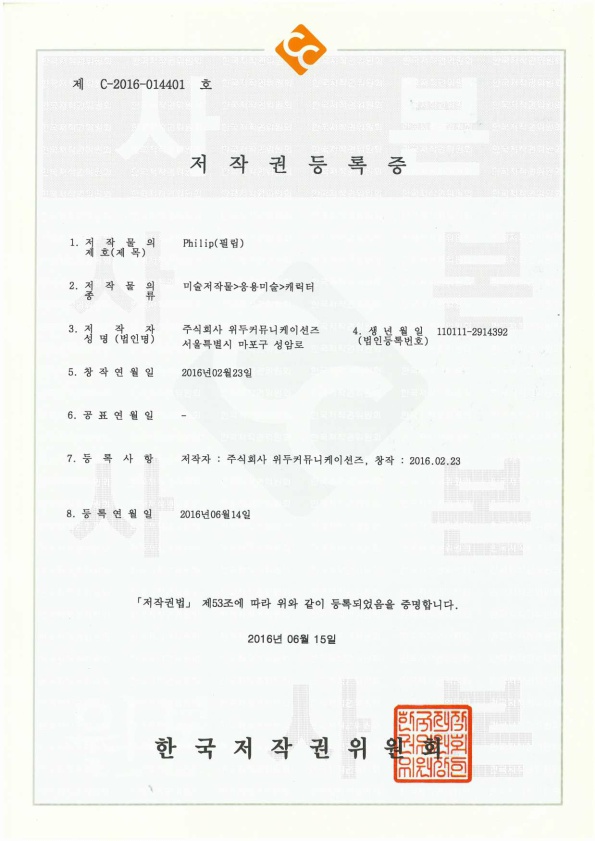 [한국/저작권] 필립 페이지 정보 작성자 WeDu 댓글 0건 조회 5,494회 작성일 19-05-30 19:09 본문 2016-06-14 저작권 C-2016-014401 필립 / 미술저작물>응용미술>캐릭터 List Previous[한국/저작권] 월터 19.05.30 Next[한국/저작권] 아리스 19.05.30