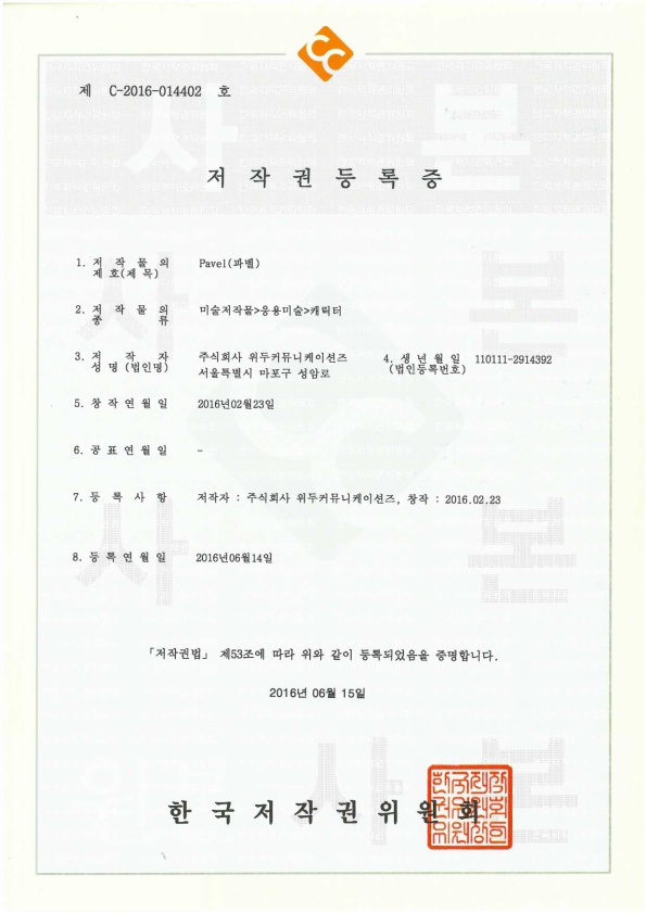 [한국/저작권] 파벨 페이지 정보 작성자 WeDu 댓글 0건 조회 5,588회 작성일 19-05-30 19:11 본문 2016-06-15 저작권 C-2016-014402 파벨 / 미술저작물>응용미술>캐릭터 List Previous[한국/저작권] 누미 19.05.30 Next[한국/저작권] 월터 19.05.30