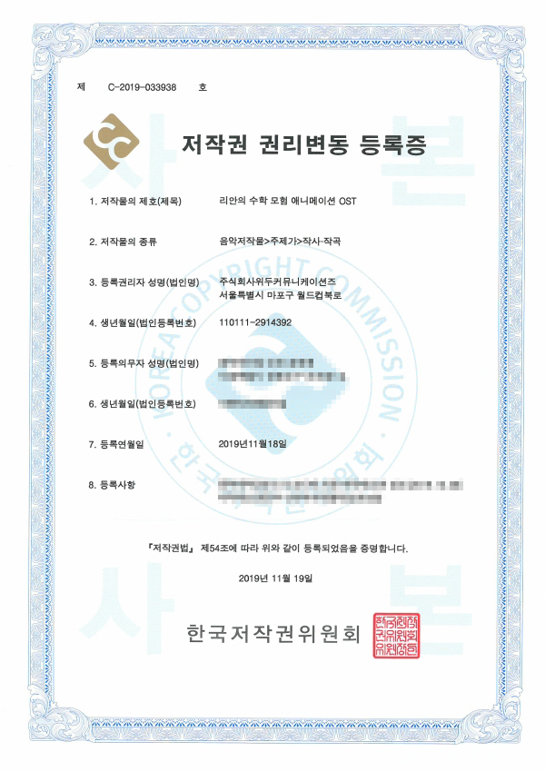 [한국/저작권] 리안의 수학 모험 애니메이션 OST 페이지 정보 작성자 WeDu 댓글 0건 조회 6,079회 작성일 19-11-25 13:54 본문 2019-11-18 저작권 C-2019-033938 음악저작물>주제가>작사·작곡 List Previous[한국/저작권] 리안의 수학 모험 여정의 시작 1,2,3,4,5 21.12.31 Next[한국/저작권] 애니메이션 리안의 수학 모험 19.11.25