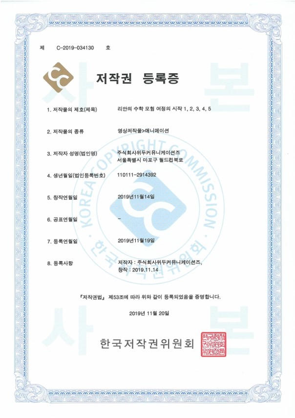 [한국/저작권] 리안의 수학 모험 여정의 시작 1,2,3,4,5 페이지 정보 작성자 WeDu 댓글 0건 조회 5,403회 작성일 21-12-31 12:36 본문 2019-11-20 저작권 C-2019-034130 영상저작물>애니메이션 List Previous[한국/저작권] OLL KIDS/MATH 21.12.31 Next[한국/저작권] 리안의 수학 모험 애니메이션 OST 19.11.25