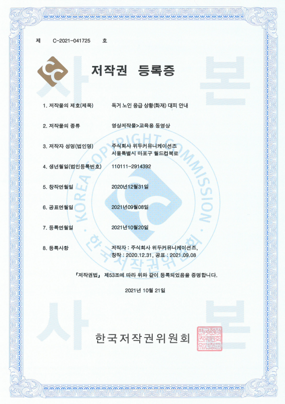 [한국/저작권] 독거 노인 응급 상황(화재) 대피 안내 페이지 정보 작성자 WeDu 댓글 0건 조회 5,840회 작성일 21-12-31 12:41 본문 2021-10-21 저작권 C-2021-041725 영상저작물>교육용 동영상 List Previous[한국/저작권] 장보기 인지훈련 게임 21.12.31 Next[한국/저작권] OLL KIDS/MATH 21.12.31