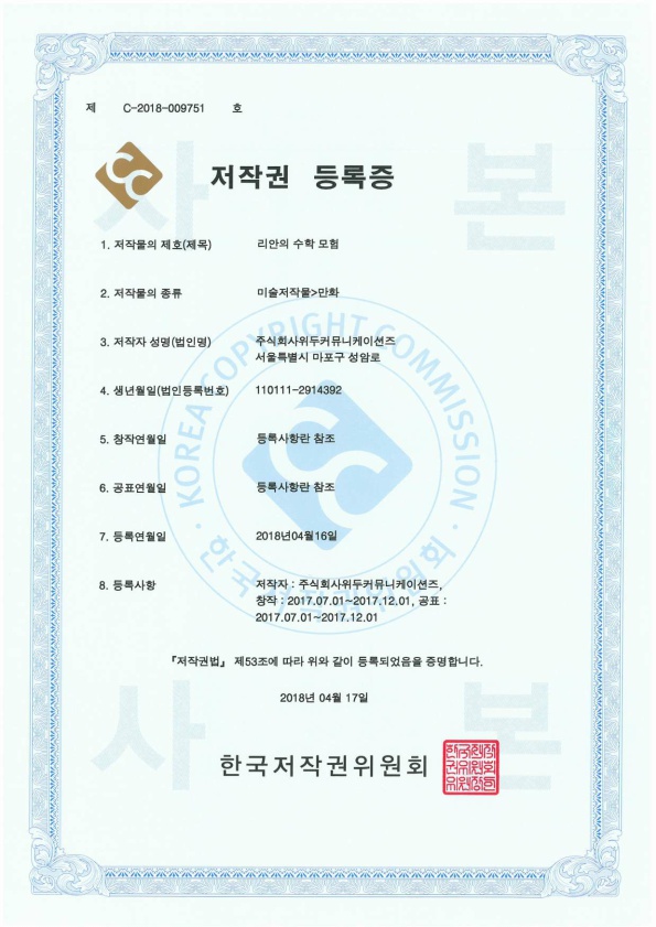[한국/저작권] 리안의 수학 모험 페이지 정보 작성자 WeDu 댓글 0건 조회 5,502회 작성일 19-05-30 19:07 본문 2018-04-16 저작권 C-2018-009751 리안의 수학 모험 / 미술저작물>만화 List Previous[한국/저작권] 길리 19.05.30 Next[한국/저작권] 신입사원조기전력화 이러닝 콘텐츠 19.05.30